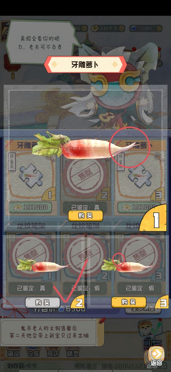 牙雕萝卜:假的根部形状不一样,真品的蛐蛐头上没有那两个触角。