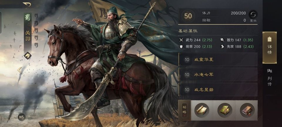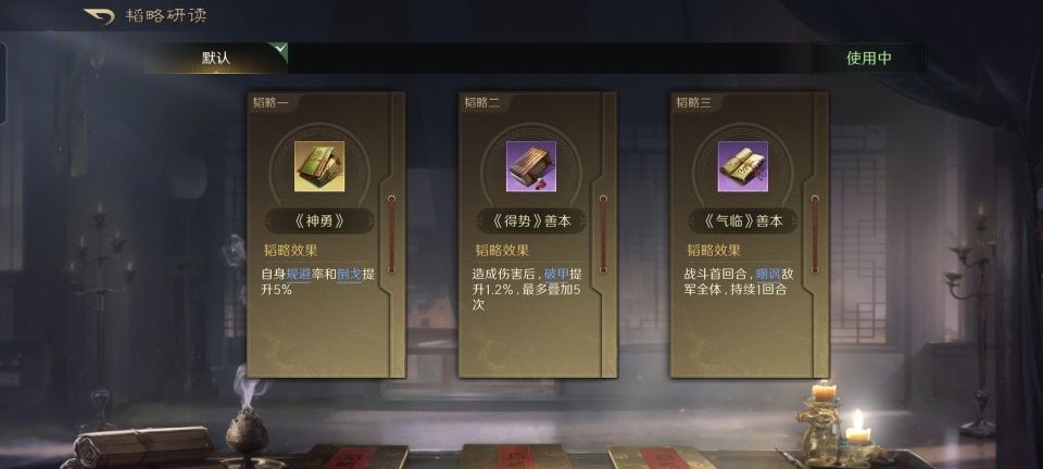 关羽在当前版本三国谋定天下里的默认战法威震华夏,几乎就是靠着敌人身上的畏惧Buff来叠加伤害的。既然赵云和张飞都附带了制敌畏惧的能力,那么身为水攻正主的关羽必定就要习得水淹七军了。韬略库里安排的三本书,依次是机动善本、水师金书和王道善本,这洪水真是给对方倒得满满的。由于机动善本的增益,关羽所携带的主动战法水淹七军、威震华夏和威名显赫都额外提升了3%的发动率。