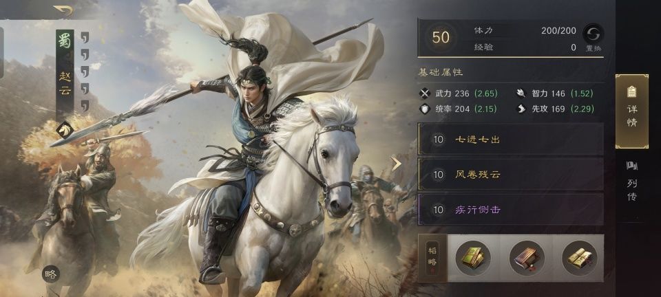 由于赵云具备七进七出的高概率规避,故而此战摆出了鱼鳞阵。赵云的第二和第三战法,分别装备了风卷残云和疾行侧击,使得他在战场上得以具备群体减速和增伤的能力。赵云的韬略库里,先后研读了专属金书神勇,得势和气临的善本。规避和倒戈概率额外多出5%,还能进行嘲讽和破甲攻击。尽管在输出方面得到了加强,不过赵云在总体上依旧是侧重于拉对面的仇恨。