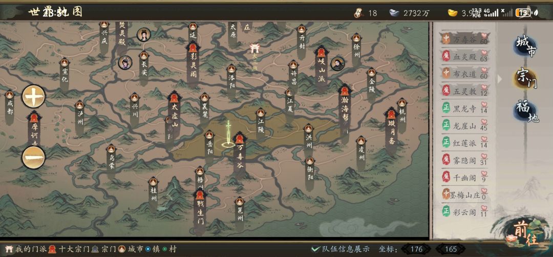 以万毒谷为例,地图点开后,右上角点宗门,便会显示万毒谷区域的所有信息,点击宗门信息,然后点击右下角的前往,便会跳转至宗门所在地图,可用于快速寻找宗门,此方法同样可用于快速寻找村镇以及城市。