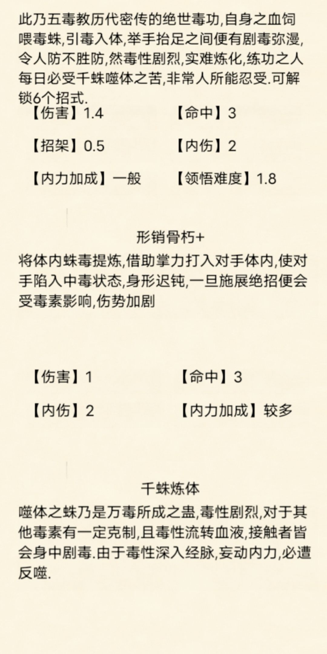 [千蛛练体](耗内800,CD10):自身陷入封穴状态,免疫对方的毒伤,为自身造成的毒伤增加4毒系数伤害(可被其他毒系数稀释),我方攻击命中敌方时必定叠加一层毒,敌方近战攻击命中我方时必定被叠一层毒。