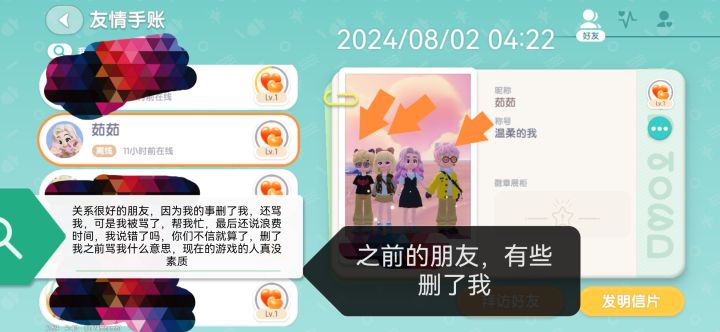 #游戏日常心动小镇 橙色的箭头是骂我的朋友 ,我是有抑郁症的,他们知道呀,知道还骂我,前男友说我没和他谈过呀,明明谈过他却不承认,然后他的各种女生来骂我,你们连事情都不知道,还说我呢?第三张是我前男友,他是海王,当着我的面前拉别的的女生,怎么我还不能说他,谈过就是谈过了,还说没谈过,后面照片是他之前和我谈的时候拍的,最后一张就是我前男友Tap tap号,希望各位朋友不要打扰我的前男友哦,小心被骗呐,二三呢是昨天骂我的那些女生还有很多,不止这些,所以我到底原谅他们还是不原谅他?,我想问各位朋友的建议,74mhsmh1这是加好友,如果各位朋友想加我,和我一块玩,可以加我,你可以给我提建议!谢谢大家的收看![[嗒啦啦2_爱你]](https://img-tc.tapimg.com/market/images/2d3f78b12a414a0e6900d44a80a35ce3.png)