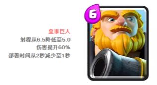 没毛病!这段话讲的太好了!官方也觉得这张卡牌实在太弱了,完全不值六费,便分别在3月23日和5月3日巨幅增强了皇家巨人,提升了20%的伤害和最关键的射程,皇家巨人的伤害直接来到了165,还能八百里开外吊打地狱塔!