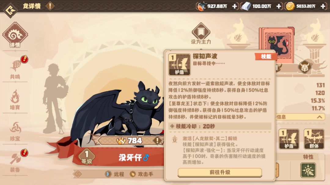 技能【探知声波】获得强化。【探知声波·强化一】:当没牙仔行动速度高于100时,奇袭的伤害随行动速度的提高而增加。