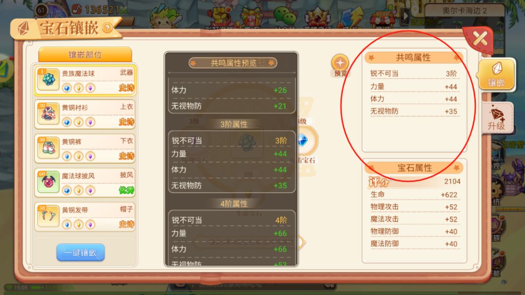 2·宝石玩法中有一项共鸣属性是玩家很容易忽略的,装备不同类型的宝石激活共鸣属性,不同的装备共鸣属性也不同,共鸣属性的的高低根据宝石的等级决定,而且不同装备的共鸣属性也不同,如武器的共鸣属性是加力量,而防具的共鸣属性是加生命和防御,饰品的共鸣属性是攻击,建议大家将更高级的宝石镶嵌在武器和饰品上,提高自己的输出能力。