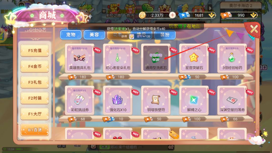 1·在商城的百货一栏中的通用洗练石每日限购二十个,仅需要花费绑点就可以购买,这是每天必须要购买的材料,用作装备附魔的必备材料,也是稳定提升属性的重要方式。