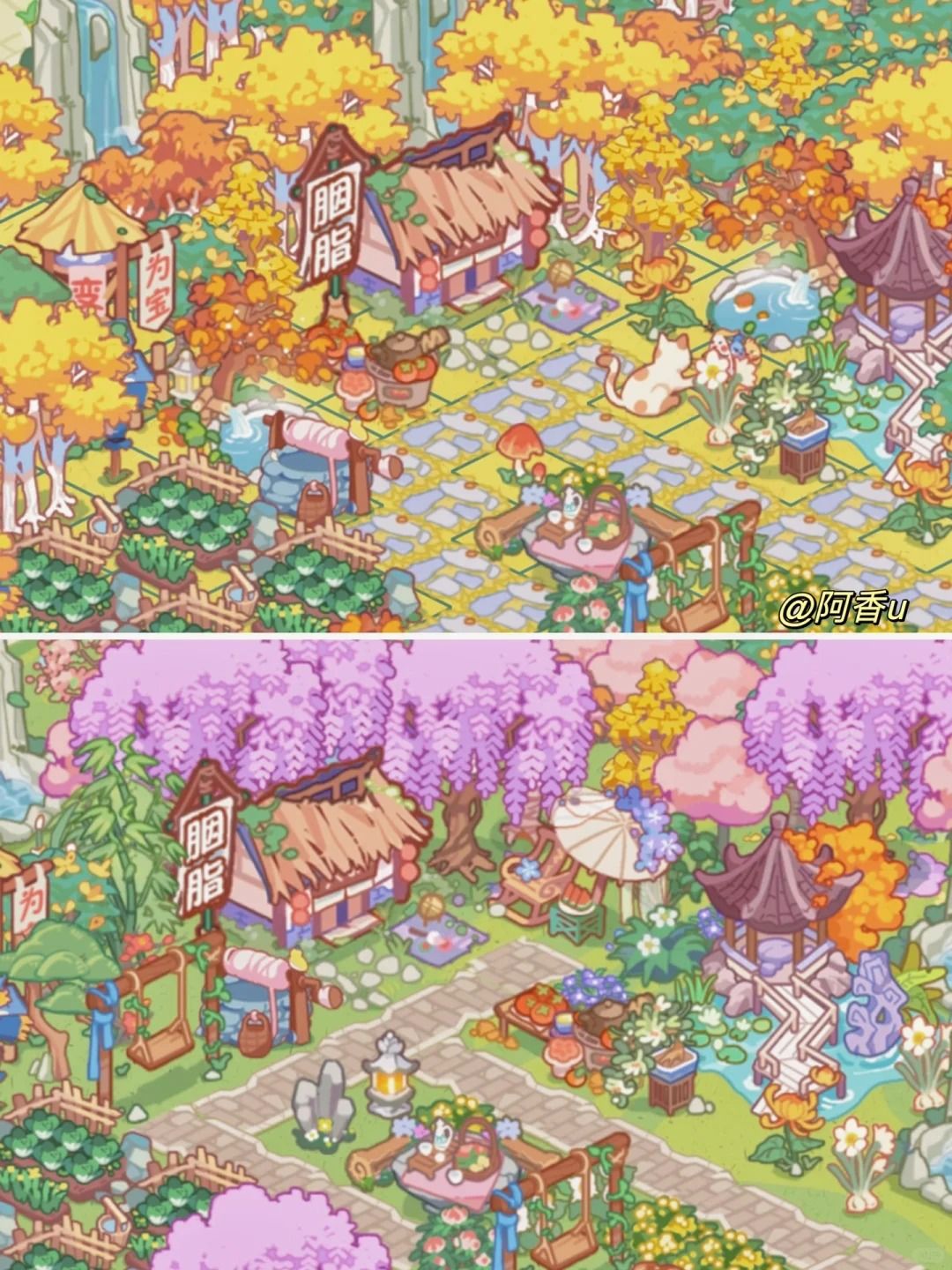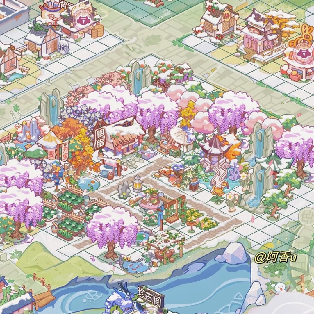 游戏里拥有四季令就可以转换季节,做了四个季节的胭脂铺小院,每个季节都很爱~转换到冬天时除了土地会变成雪地,树上各种建筑上也会铺满雪哦~