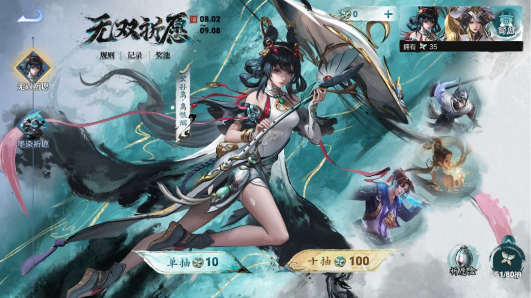这一次的无双祈愿活动,首抽官方赠送9枚离烟币,我们只需要花10点券,再购买一枚离烟币,即可免费抽一次。