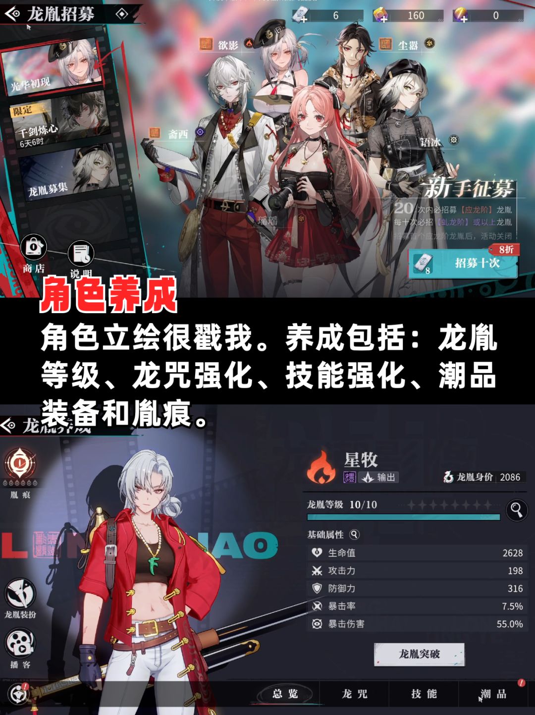 💪 养成系统:包括龙胤等级、龙咒强化、技能强化、潮品装备和胤痕,和大多数卡牌类游戏相似。队伍组成是标准的三人队,角色有不同养成线和技能槽位,装备有套装效果。