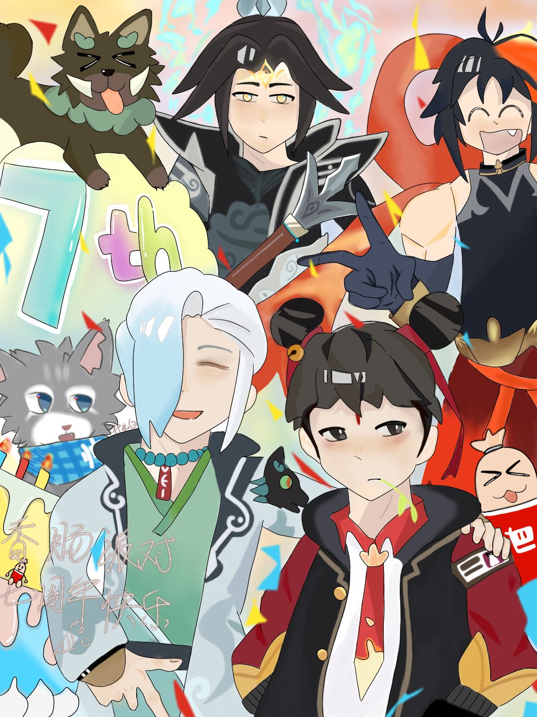 蛋糕也是不会画的,我算是知道为什么没人画杨戬了,衣服这么复杂(; ̄д ̄)头发也画劈叉好,私心就添了缅因喵上去(其实是第三层蛋糕不会画。。