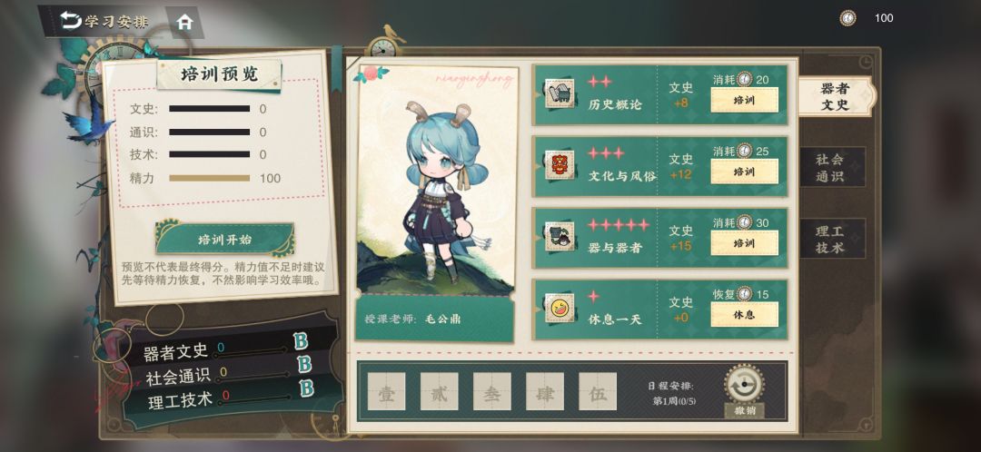 (六周一个周期,星期六日会自动回复30点精力,无法选择训练)