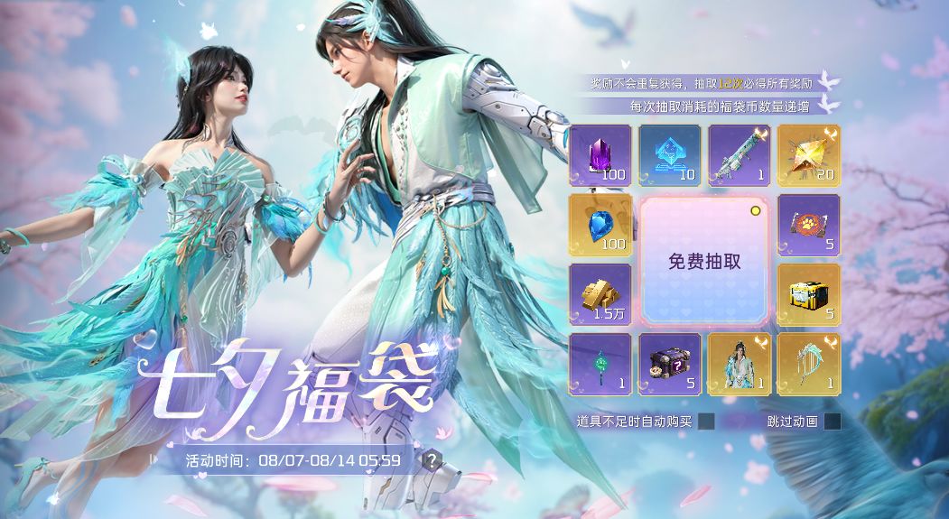 长乐未央,长毋相忘~活动期间消耗七夕福袋币可抽取福袋,每次抽取消耗的福袋币数量递增,奖励不会重复获得,抽取12次必得「青鸾羽」时装、「青羽·鹊桥」武器皮肤、「天籁之琴」背包等所有奖励!