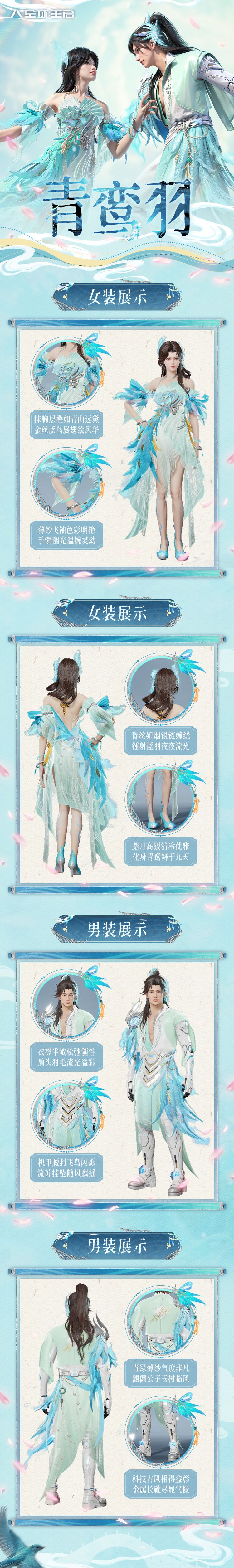 翠羽青鸾舞碧空,仙姿曼妙醉苍穹~「青鸾羽」时装包含整装、手部、鞋子、头饰共四个部位,女款抹胸长裙搭配羽毛裙摆,青翠色彩衬得人如同天上仙女;男款则为古风搭配未来感机甲,薄纱羽毛仙气飘飘,翩翩公子气质拉满。