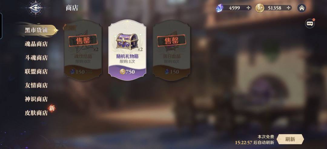 作为商城的第一栏货物,黑市里面可是有不少好东西,部分商品可以通过金魂币购买,而部分商品则需要通过魂晶购买,玩家们每天有一次免费刷新的机会。