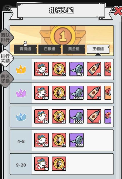 王者组第一名:诸葛亮碎片*220、皮肤币*35、涂改带*100000、锁定剂*20,称号*1;