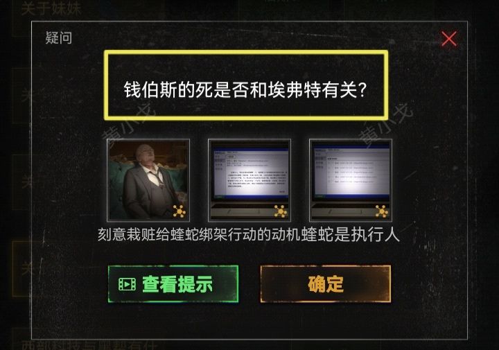 28.给疑问:是蝰蛇谋害了钱伯斯吗?填入线索(没接触作案工具、蝰蛇穿着普通鞋);解锁线索(刻着栽赃给蝰蛇)