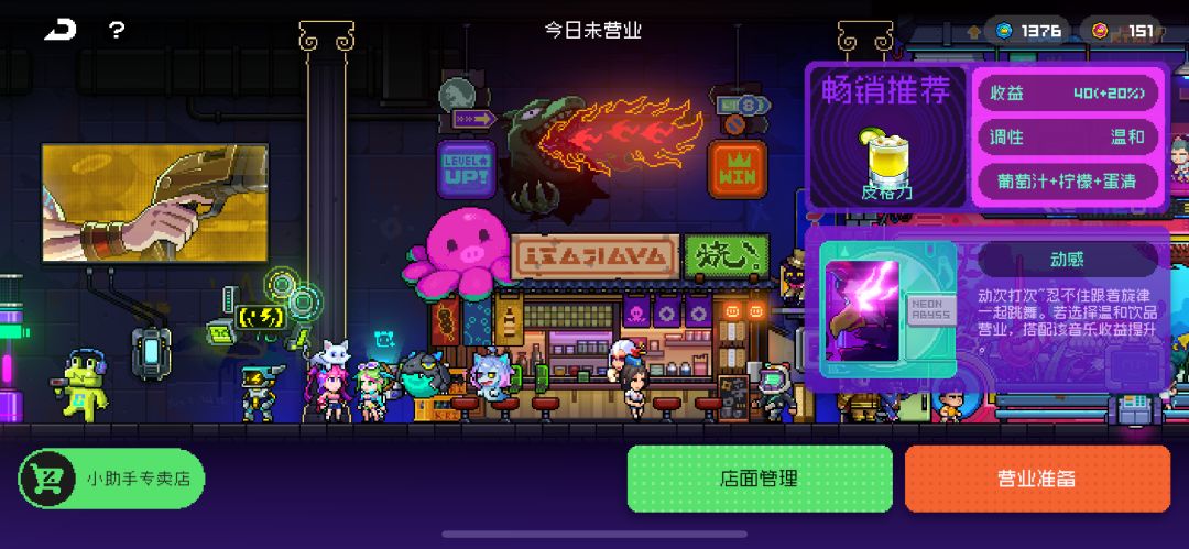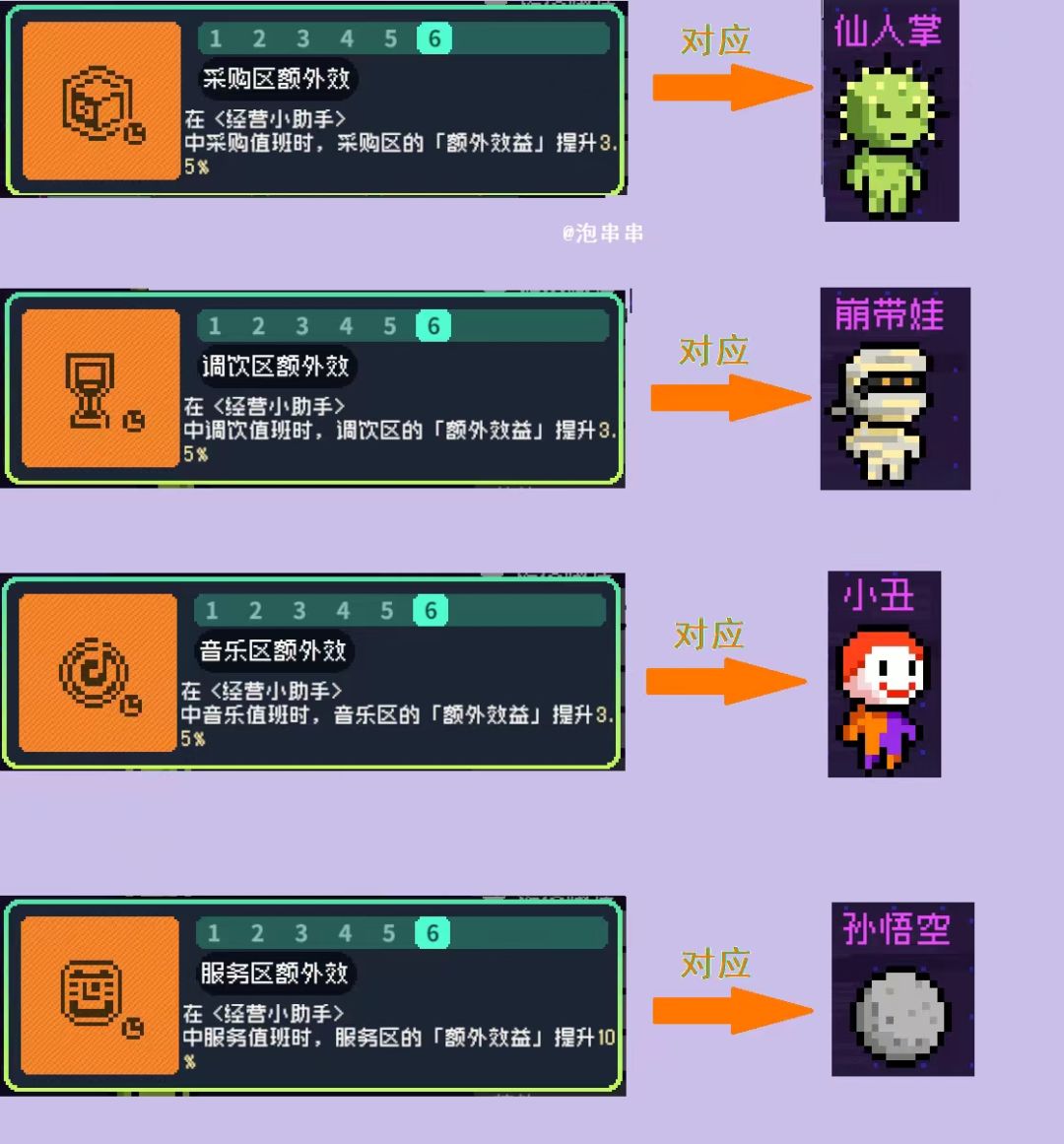 经营内容主要包括采购区、音乐区、调饮区、服务区4个方面,分别对应宠物仙人掌、小丑、崩带娃、孙悟空。这也是我上期帖子为什么要多次强调不要轻易消耗上面四种紫色宠物的原因。