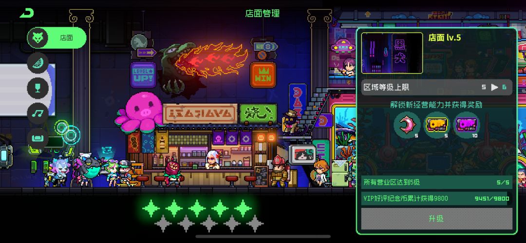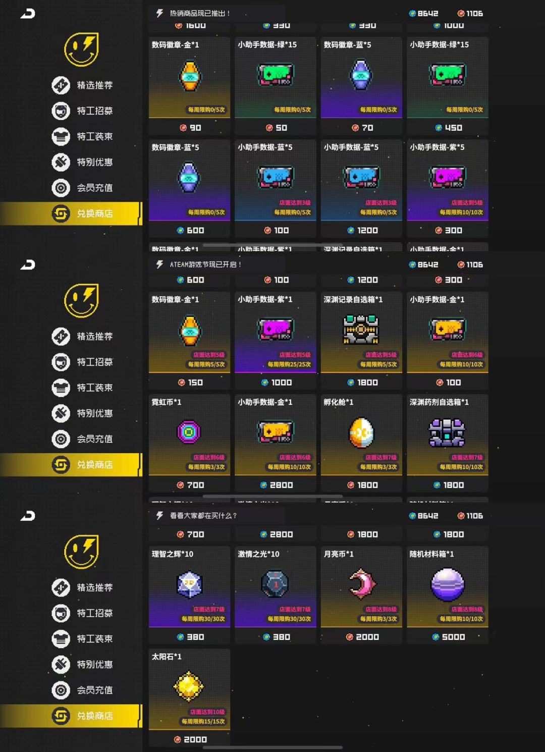 此外,累计获取一定量的VIP好评纪念币,可以提升店面等级,从而提高每日收益上限。店面达到一定等级即可解锁小众点评商店中多种材料的购买资格(店面升级会赠送一些月亮币、宠物舱和小助手数据),比如达到5级店面后每周可多购买5个金色数码徽章和紫色小助手数据,达到6级店面后可购买金色小助手数据,达到10级店面可以购买太阳石。