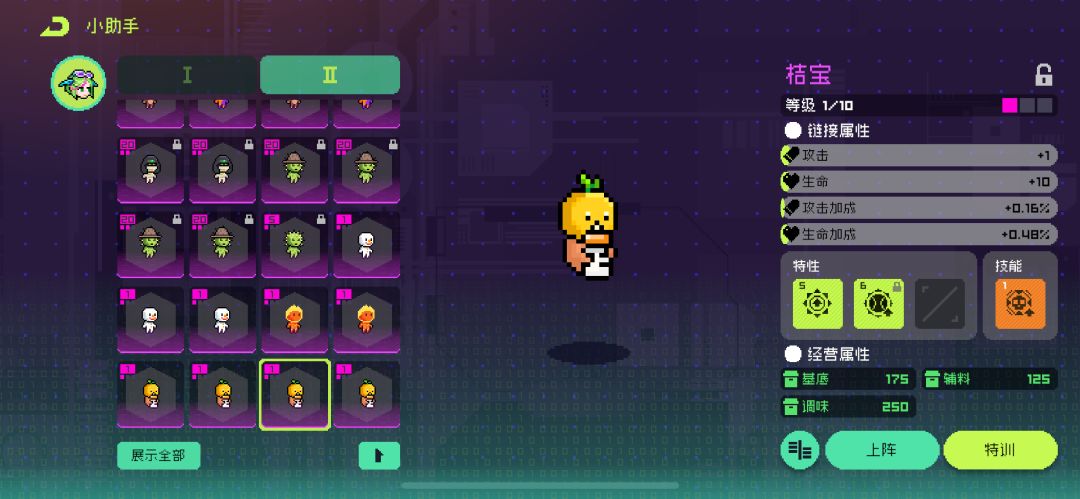 4、选择初始律动属性最高(250)的小丑,特性选择律动专精、律动特长,养2只。