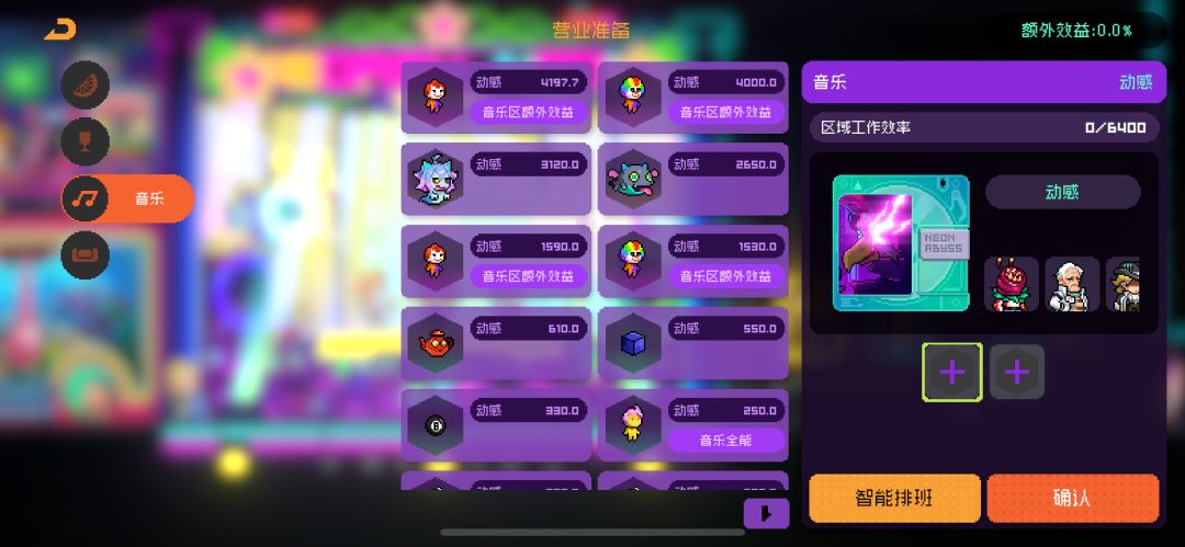 3、音乐区目前工作效率为6400,共有激情、动感、狂热、律动四个方向,每天可上阵2只对应属性的小丑,这里因为今日推荐音乐是是动感,所以我们优先选择动感属性最高和第二高的两只小丑。