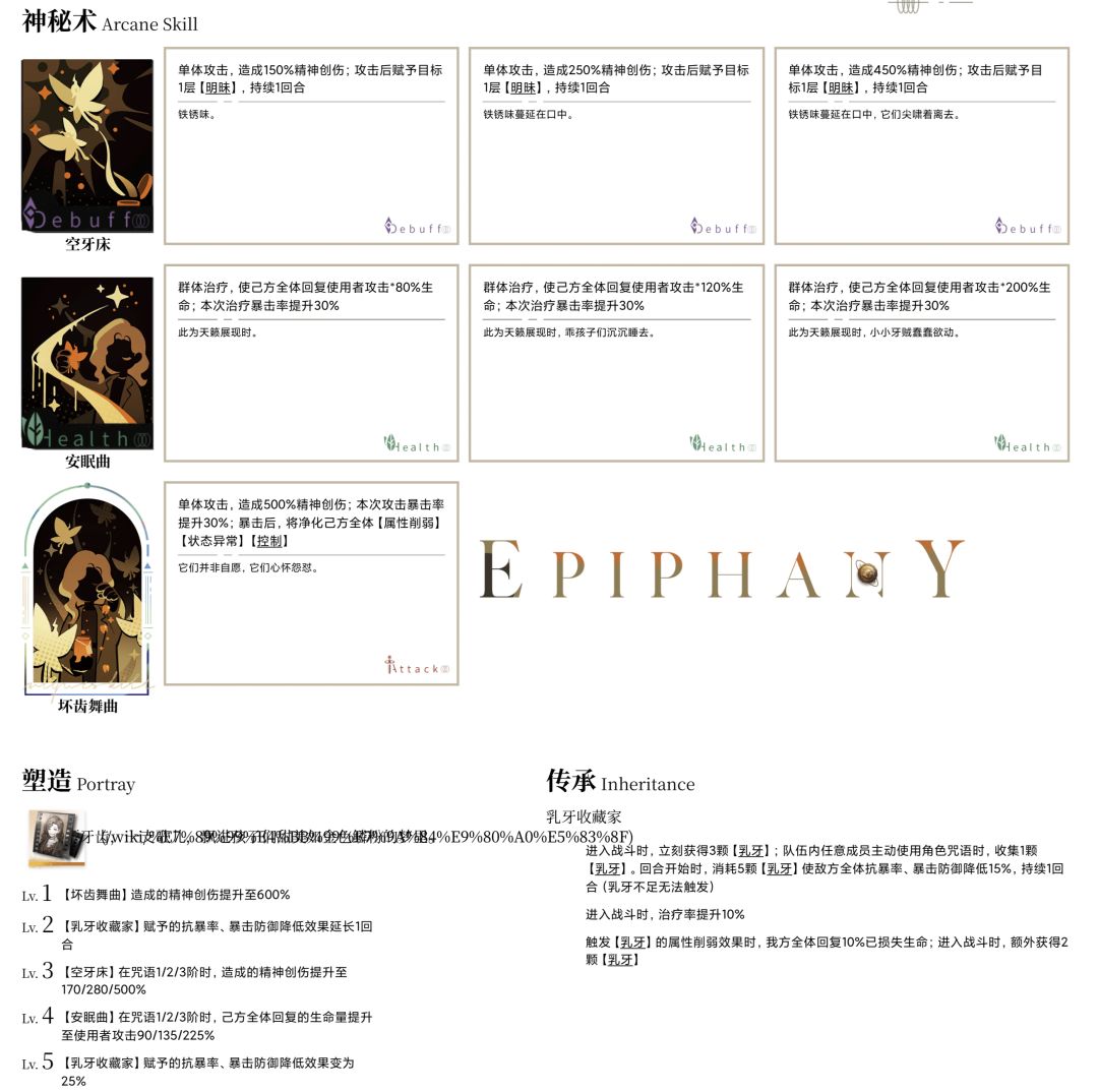 先顺着讲传承的效果。牙仙的传承效果为:洞悉1,依据一定的机制获得[乳牙],然后达到一定层数后,消耗5颗[乳牙],降低敌方抗暴率与暴击防御;洞悉2提升属性;洞悉3,在触发[乳牙]的属性削弱效果时,立即回复队伍10%已损失的生命,同时在战斗开始时多获得2颗[乳牙]。从上来看,她洞悉3的提升是相当不错的,可以自动回血,大大降低对牌权的需求。需要尽快洞悉3。