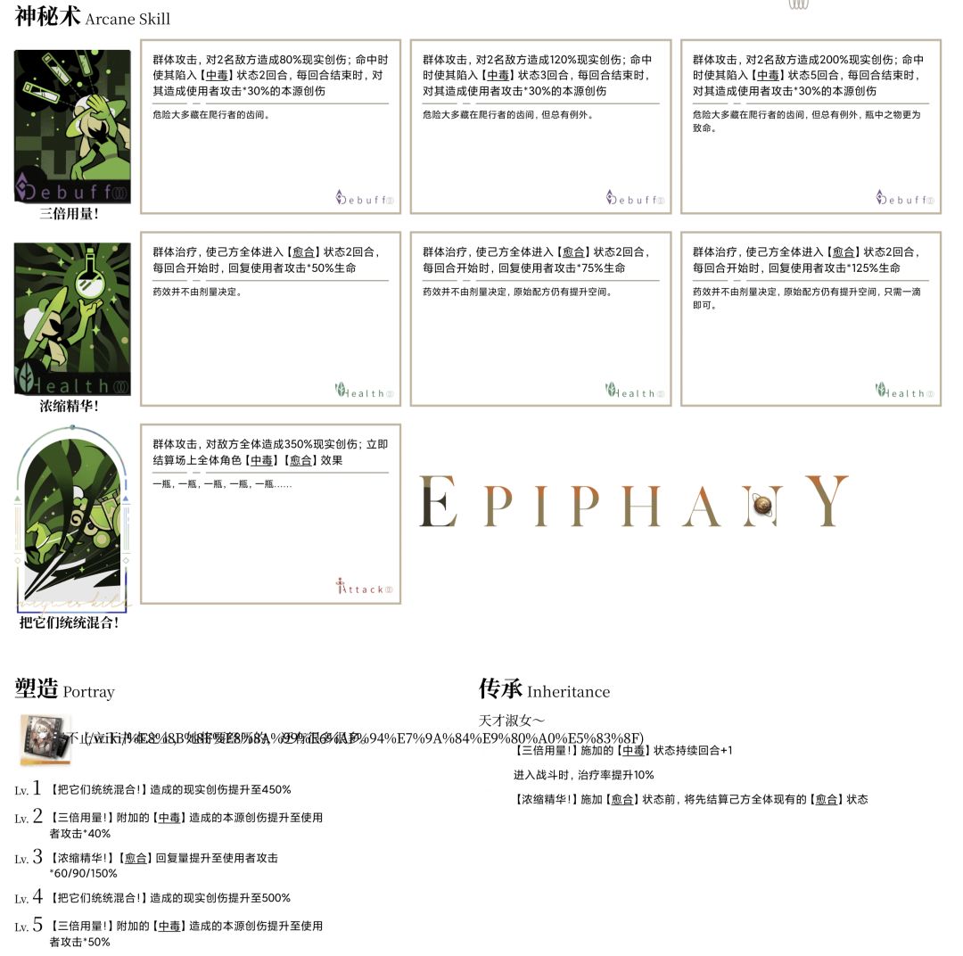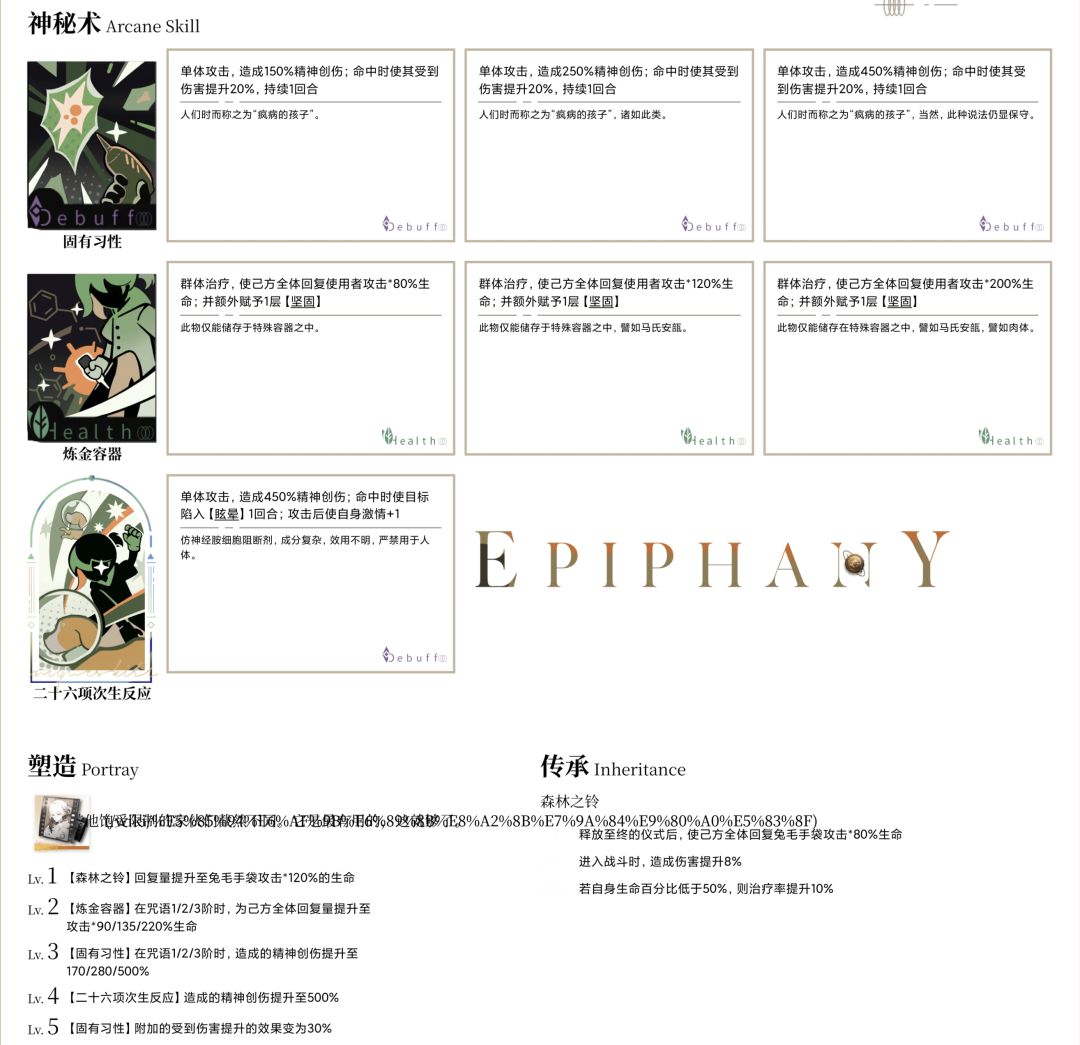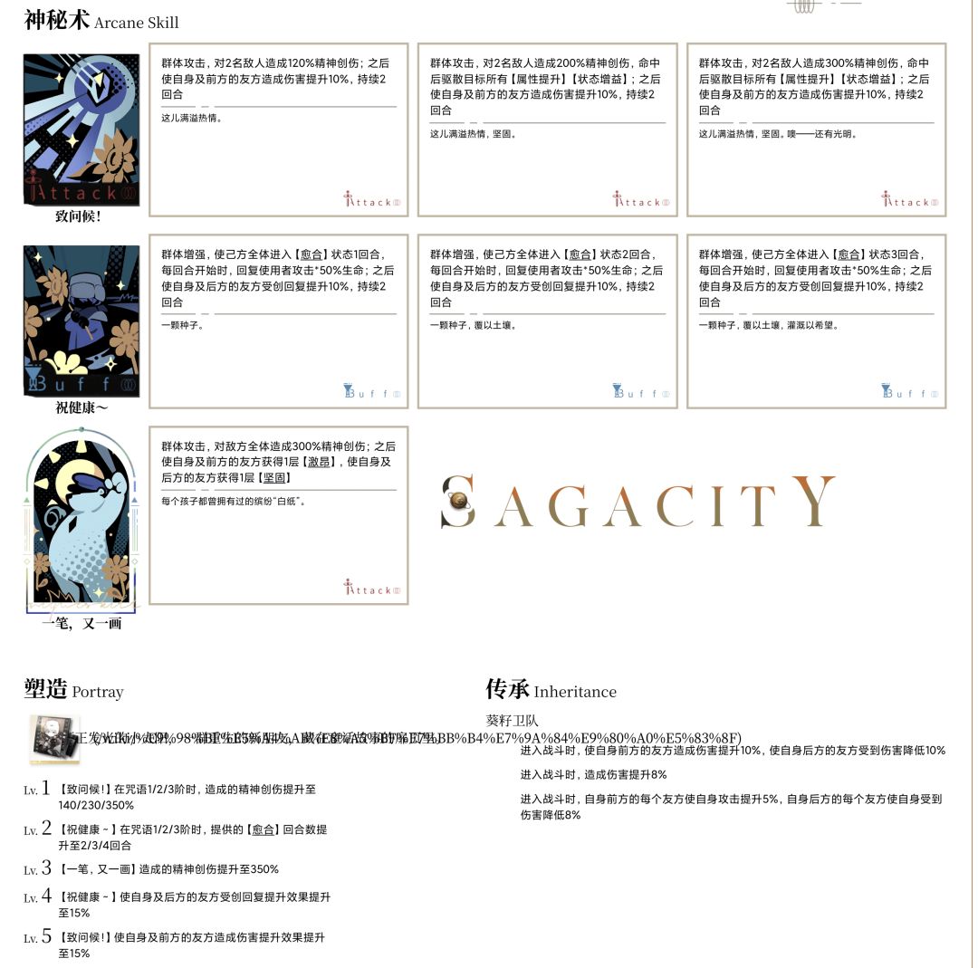最后是他的传承,“葵籽卫队”,和塑造的效果。洞悉一是使身前和身后的友方分别获得一定的状态(造成伤害增加以及受到的伤害减少);洞悉二是提升自身造成的伤害;洞悉三是令身前和身后的友方分别使自身攻击值提升和使自身受到伤害降低8%。塑造的效果基本都是提升技能倍率,仅有塑造二延长神秘术“祝健康~”施加的[愈合]的回合数。