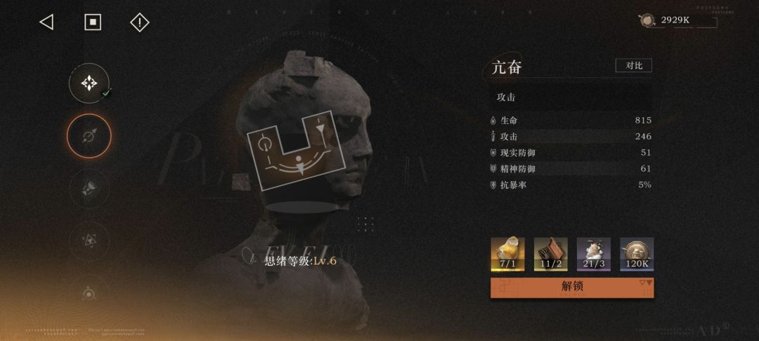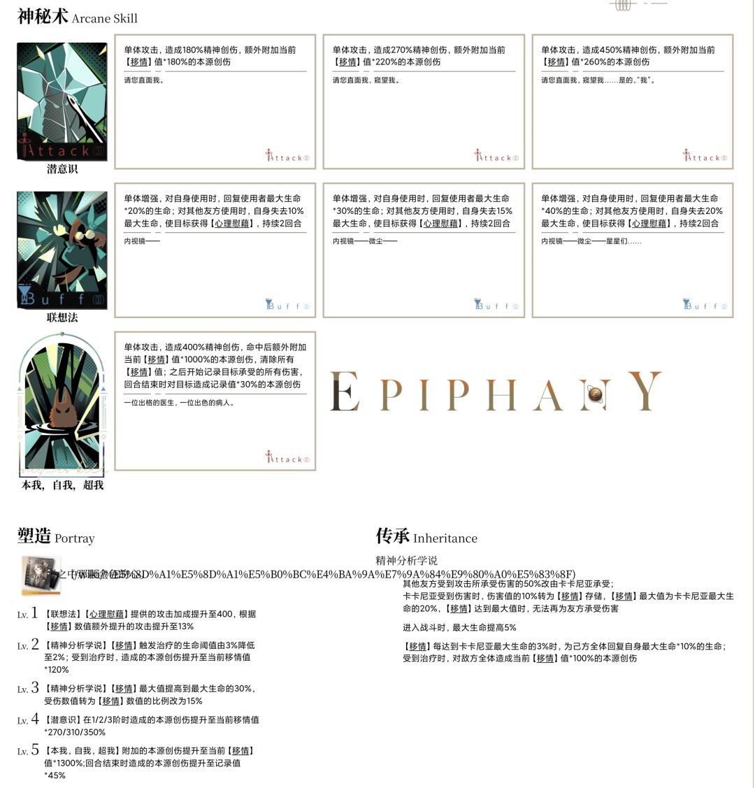 为了方便理解,先倒回去讲“精神分析学说”的其他效果。洞悉1,其他友方受到攻击所承受伤害的50%改由卡卡尼亚承受,卡卡尼亚受到伤害时,伤害值的10%转为[移情]存储(等价于友方受到的伤害只会有5%转换为“[移情]”值),[移情]最大值为卡卡尼亚最大生命的20%,[移情]达到最大值时,无法再为友方承受伤害;洞悉2则是一般地提升属性。