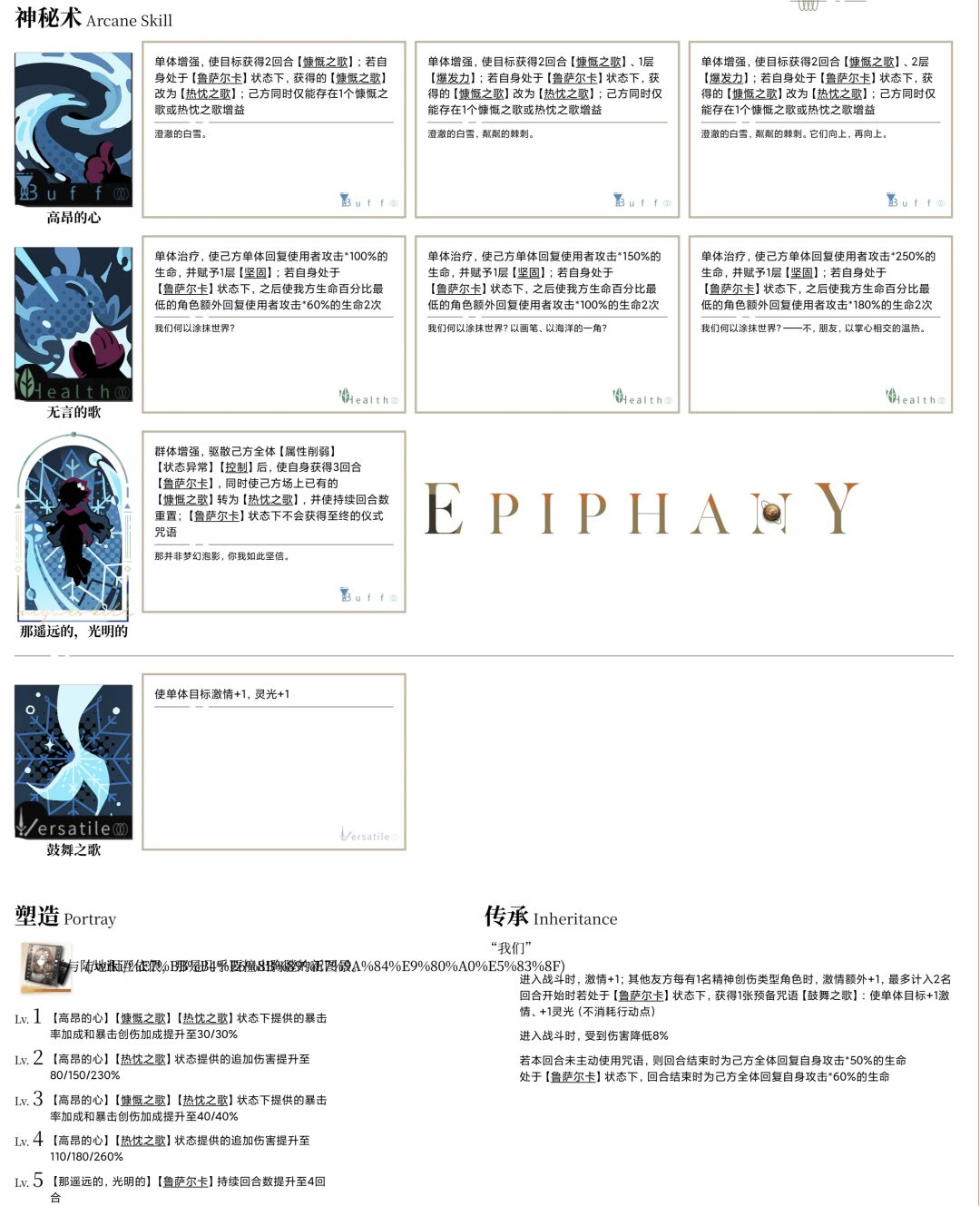 是时候讨论其传承,“ ‘我们’ ”,和塑造的效果了。洞悉1,战斗开始时统计其他为精神创伤类型的友方的数量,并获得一定的激情,并且回合开始时,当维拉处于[鲁萨尔卡]时获得一张预备咒语“[鼓舞之歌]”,使得一位友方激情与灵光各+1;洞悉2简单地提升其属性;洞悉3则赋予其在她自己不行动的情况下恢复友方的能力,进一步降低维拉对牌权的需求。洞悉3增强不小,降低行动要求,有就基本必升(资源允许的情况下)。塑造方面,前4次都是提升神秘术倍率,重点在塑造5,延长了1轮[鲁萨尔卡]的持续时间更进一步地降低了她对于牌权的需求。