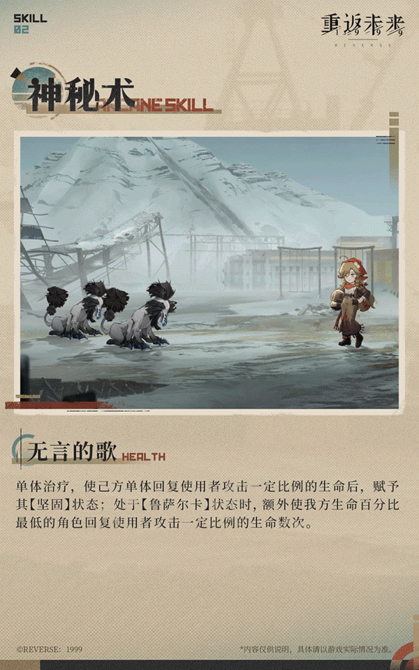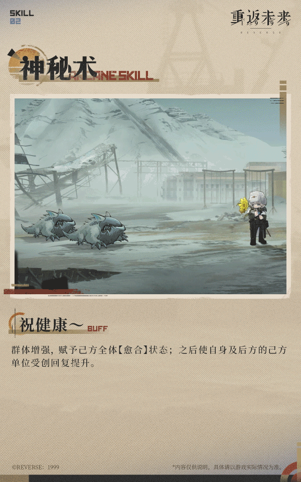 还是先来了解他的治疗手段。神秘术“祝健康~”,赋予己方全体[愈合]状态,随后使自身以及身后的友方角色受创恢复+10%。