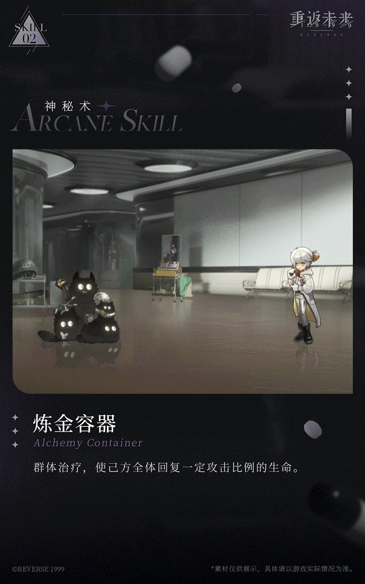 她的治疗手段是依靠神秘术“浓缩精华!”为队友提供[愈合]的增益状态,使得队伍在回合开始时恢复生命。