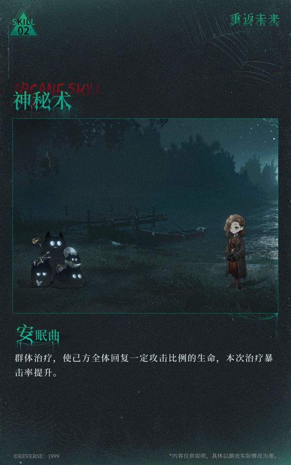 牙仙的主要治疗手段是神秘术“安眠曲”。其效果为为己方全体恢复一定比例的生命,同时该神秘术暴击率提升一定数值。