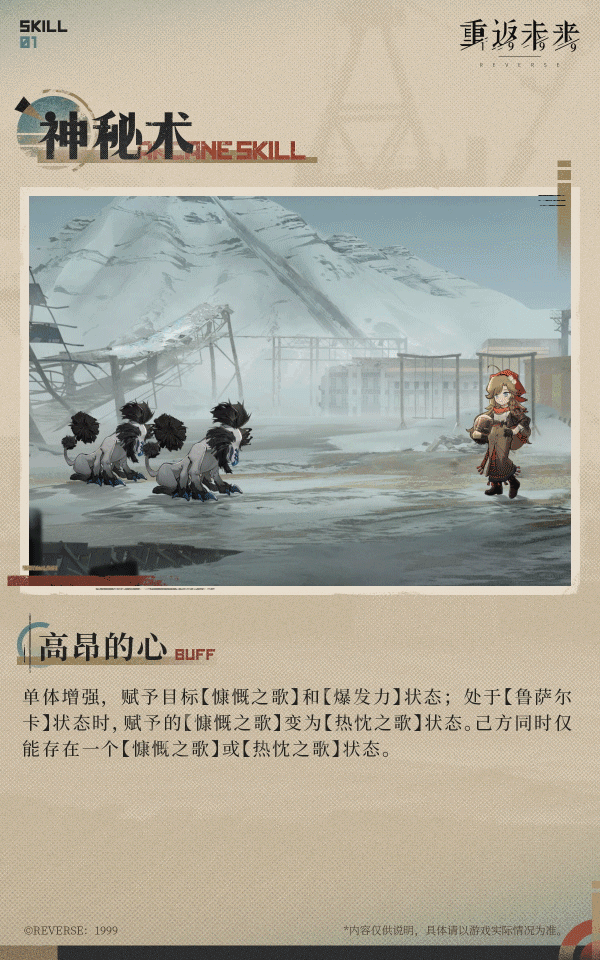 相对而言,是个比较一般的神秘术。具体原因参见苏芙比相关的部分。“受创恢复”这个名词倒是值得再提一下,它的机制是角色在受到敌方攻击后,在回合开始时(这里的“回合开始”指的是具有“受创恢复”的单位的回合开始)恢复“ ‘上回合累积受到伤害的总量’ * ‘受创恢复比率’ ”的生命值。
