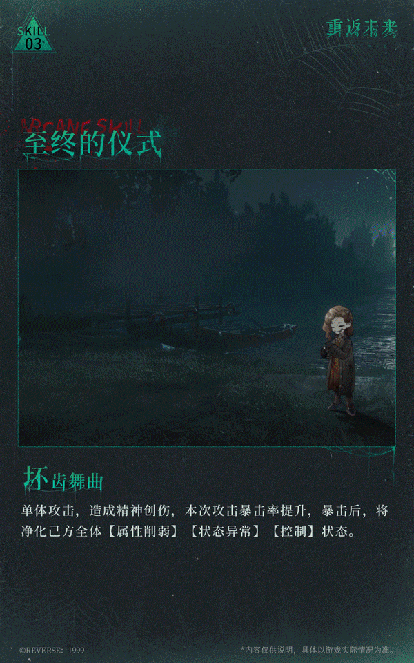 说回至终的仪式,“坏齿舞曲”。其效果为:对敌方单体造成一定伤害,同时本次攻击暴击率提升,若暴击,则净化己方[属性削弱][状态异常][控制]。早期为数不多的解控途径,不过实际效果较为一般。