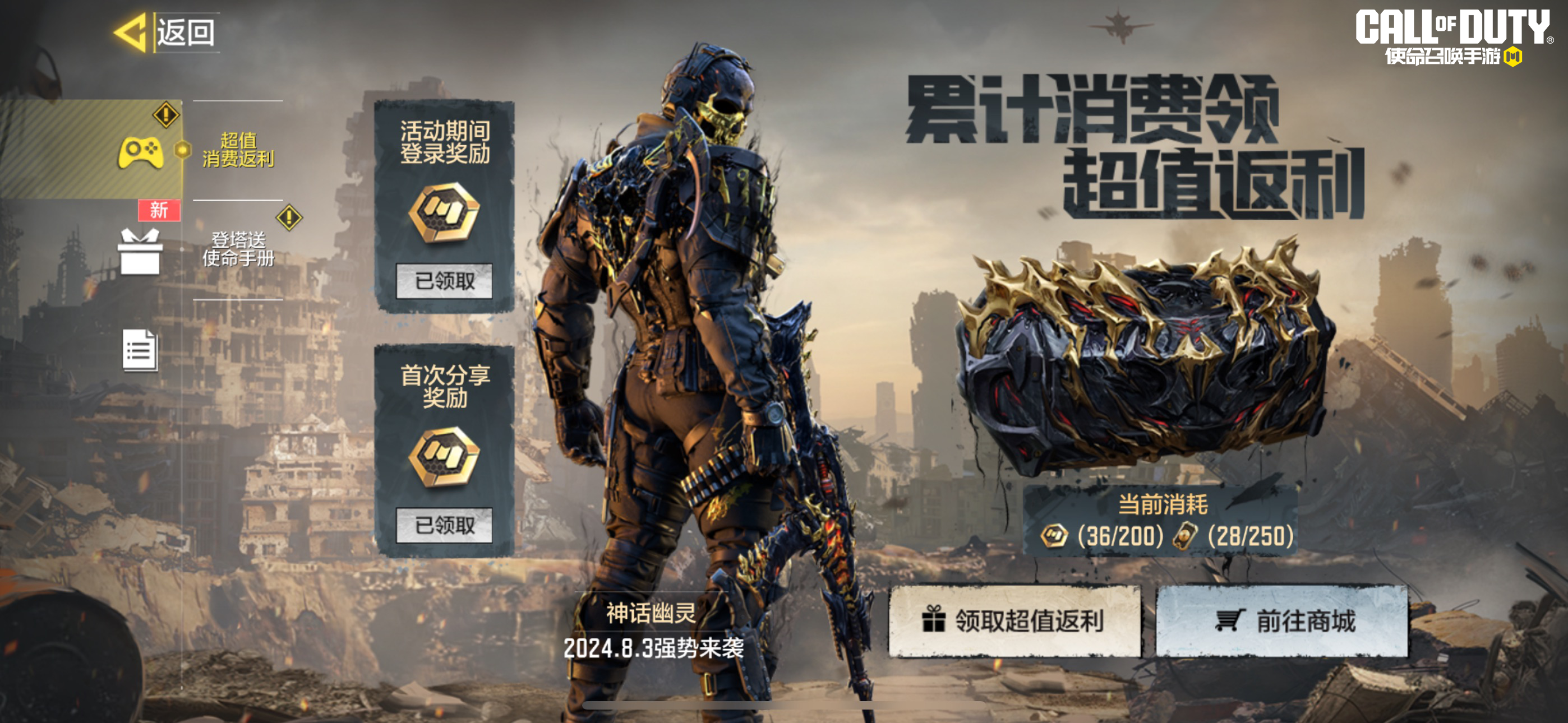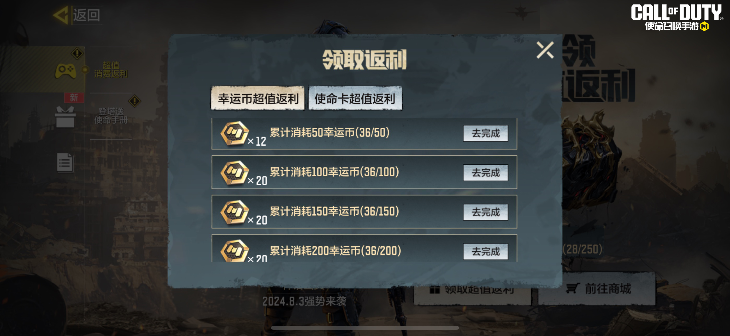 除了充值返利以外,累计消费领超值返利活动也将正式接棒。8月2日-9月7日,战士们完成特定消费任务,即可领取使命卡片、幸运币等超值奖励!