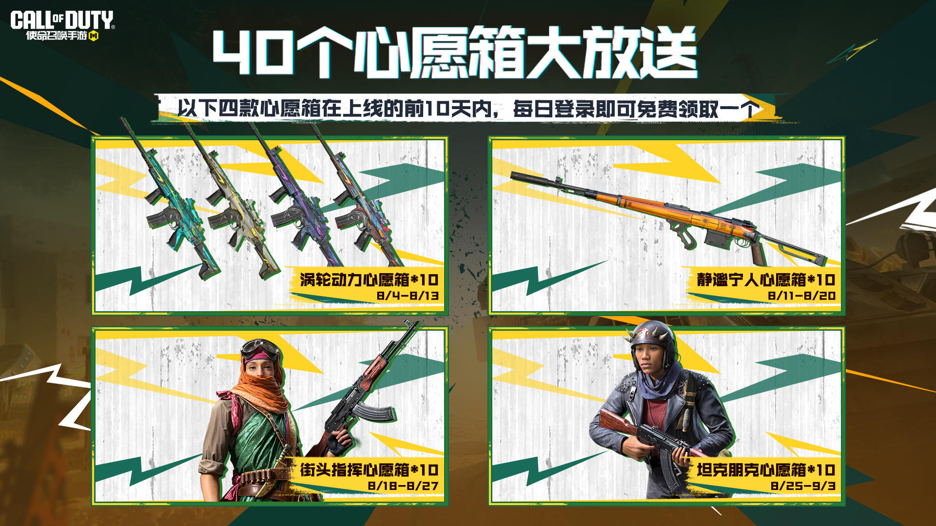 本次一共送出四种心愿箱,赠送时间有部分重合哟,其中周日、周一、周二每天登录都可以领取2个心愿箱,战士们可千万不要错过了!