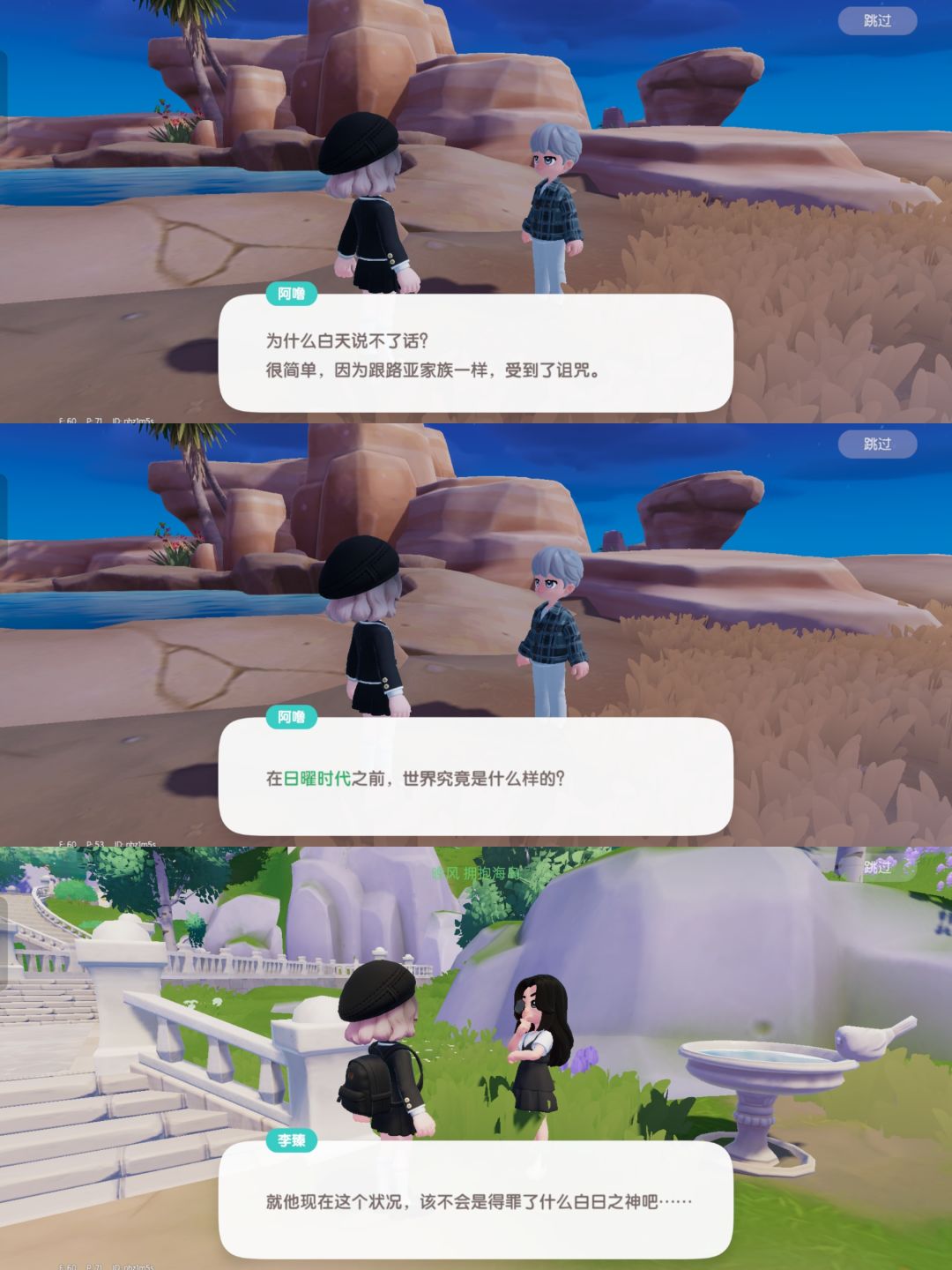 上一条评论有宝子说晚上阿噜可以说话,于是我晚上去找了一趟阿噜,发现了他白天不能说话的秘密。从阿噜聊天中标绿的字以及李臻的猜测,我推测万尼亚家族应该是在日耀时代便已经被诅咒了,而阿噜发现了这个秘密以后被这个世界知晓并一同诅咒,具体看下一条