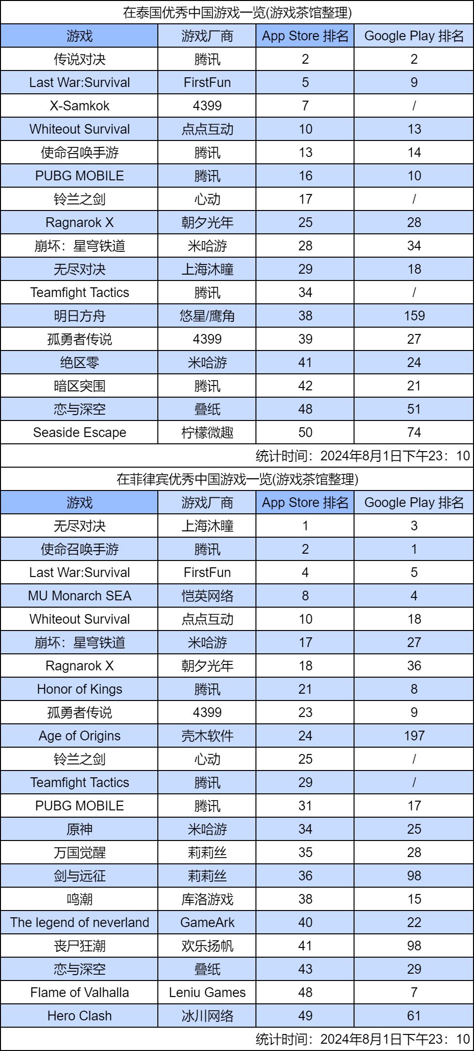 在本期东南亚出海秀中,腾讯发行的《传说对决》和沐瞳科技的《无尽对决》分别是泰国和菲律宾手游畅销榜最靠前的国产游戏。