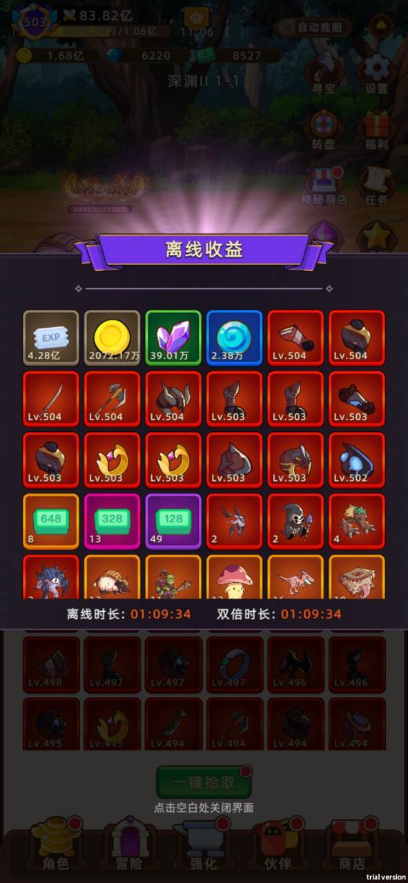 一直推,503级,深渊2,一分钟600多经验,金币高。