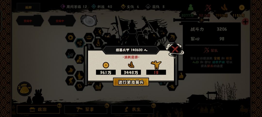 因为时代特点开局拿不出三级建筑,导致这套常规的太守起步没法使用,那就在时代政策里面抠科技和士子和战力,用剿匪和出征来刷陈群的士子。等顶级甲骑和屈原科技政策一开差不多就破局了。