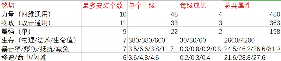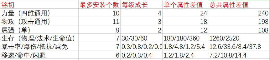 这里我们可以看出,铭切升级对于属性的成长加成是非常明显的,很多种铭切的成长幅度达到了100%,而且像是暴击率/暴伤这两种铭切对于一些依靠双暴的套装,其可成长性的意义是重大的。