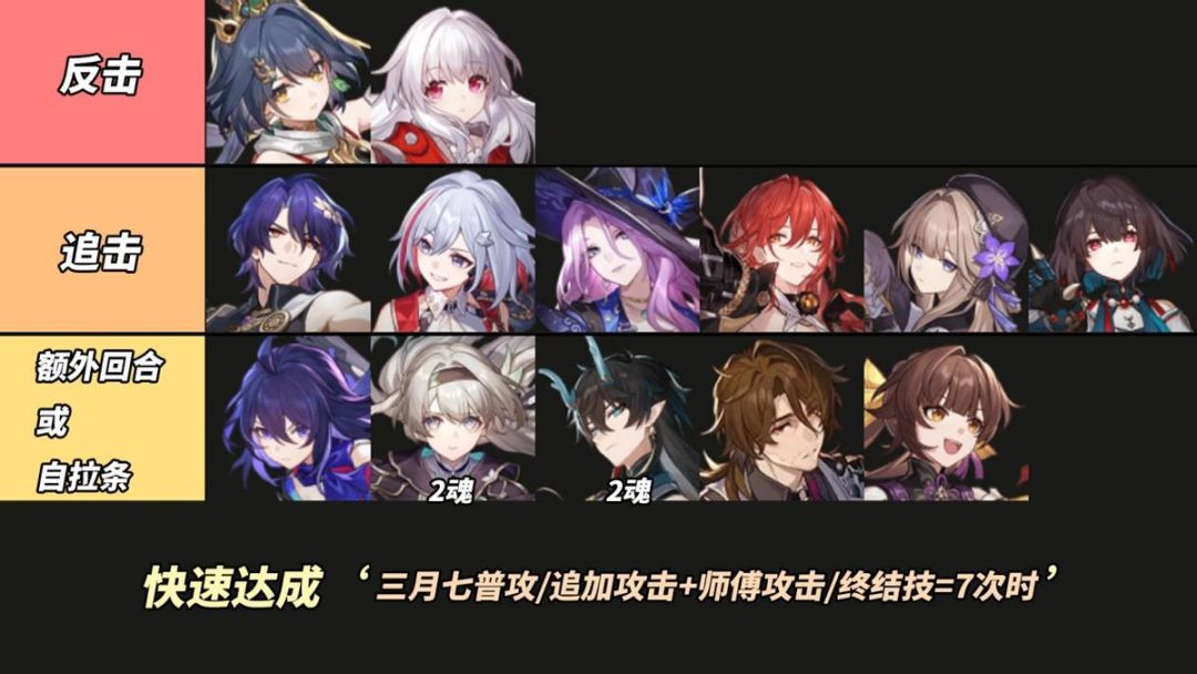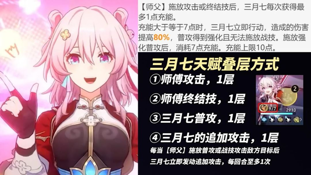 为了最大化发挥三月七优势,队伍需有一位多动角色成为她的师傅,快速叠天赋打出更多强化普攻。多动的定义挺广泛,例如:希儿、2魂流萤、加拉赫的高速/自拉条/额外回合,云璃、克拉拉的受击反击,真理医生、托帕、黑塔、姬子的追加攻击等等。