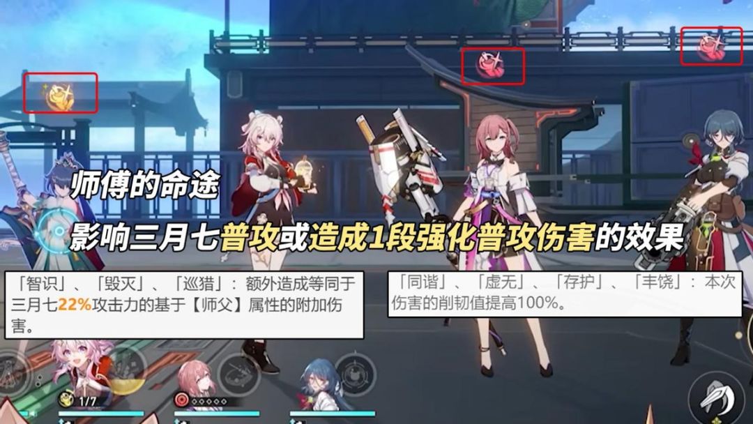 少量场景有切换师傅的情况,因为三月七的普攻/首段强化普攻效果与师傅命途有关,若为‘巡猎、智识、毁灭’则造成与师傅属性相同的22%攻击力附加伤害,若为‘同谐、存护、丰饶、虚无’则该伤害削韧值提升100%。