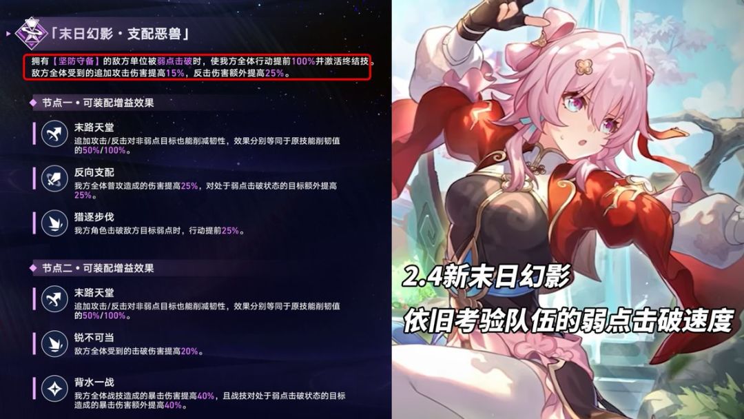 当冻梨列出这个第①点后,突然想明白为何老米会选择赠送满魂三月七(2.4三魂、2.5满魂)了!不知大家可还记得暂时只开了1期的‘末日幻影’?2.4新一期的敌人效果也已经公布,依旧采取击破敌人弱点获得高额回报的模式。