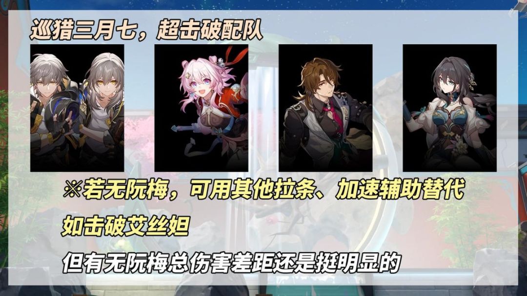 【配队】①同谐开拓者+巡猎三月七+加拉赫+阮梅(若无则用拉条、速度辅助替换)。②在流萤、波提欧队伍中,作为无阮梅玩家的替代,协助快速削减敌方韧性条。