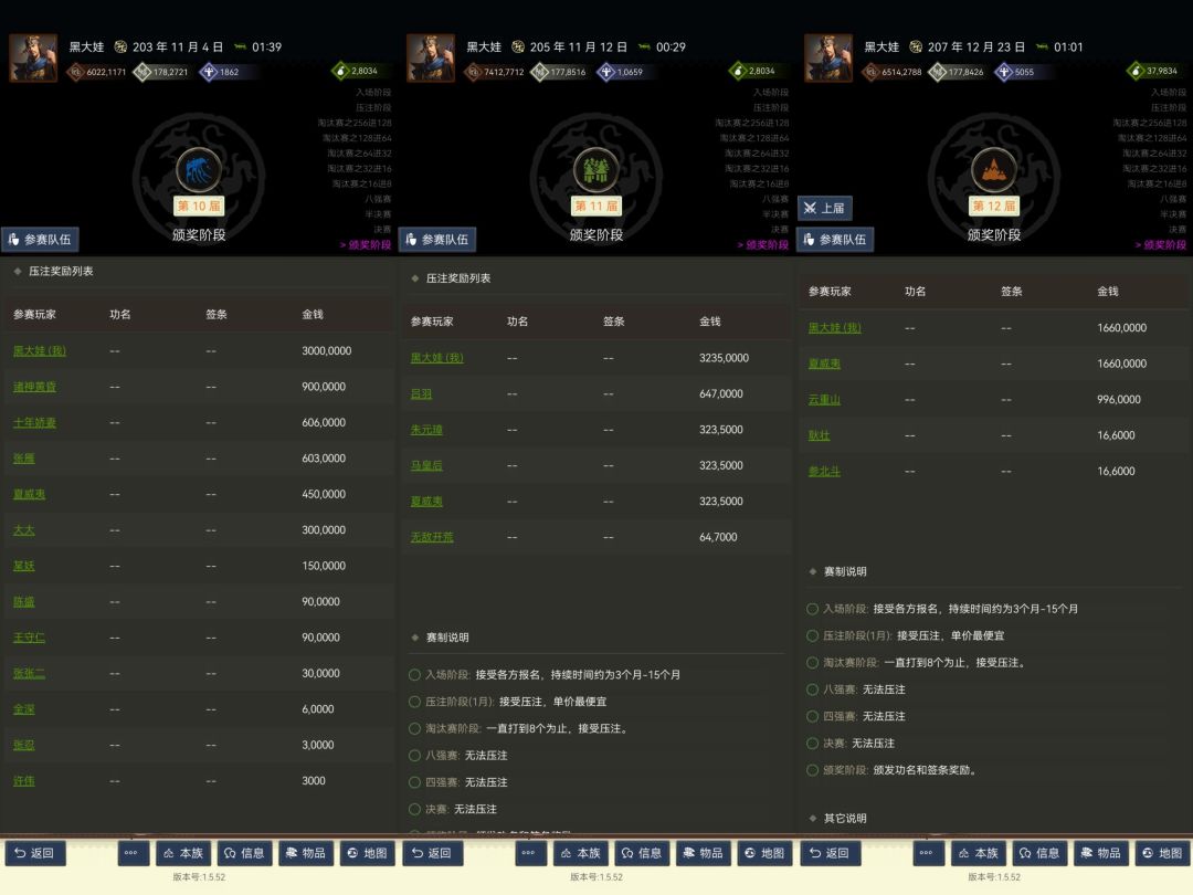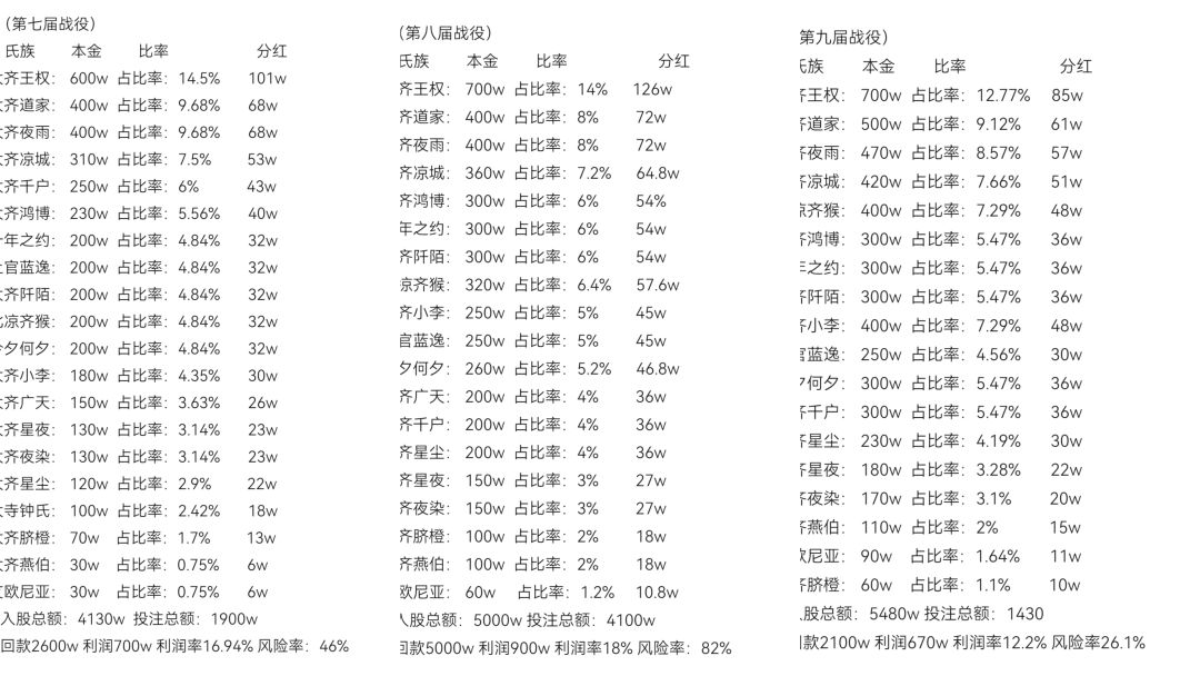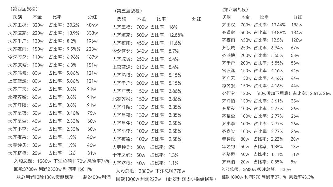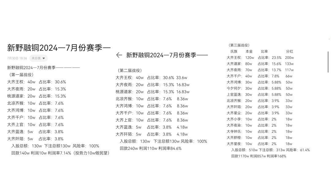 2、(齐猴、章邯、韩将军汝南聚盟)之后齐旧归襄阳区、又于汝南区,皆在落地战无法取得优势也无法重启统一经济的计划。直到与章邯韩世忠会于聚盟,计划称霸汝南失败之后 章邯提议全部转战新野。五月新野赛季乃是三势力磨合期,多事无闲而无法抽身经济工作。六月赛季三盟彻底在巴国融于一聚盟,管理层充盈使得齐猴又得以开展经济工作的尝试,虽然开展较晚但是尝试还是非常成功,凡是齐猴参与之局皆以榜首耀眼。此次齐猴彻底感受到了大资金所带来的优势。