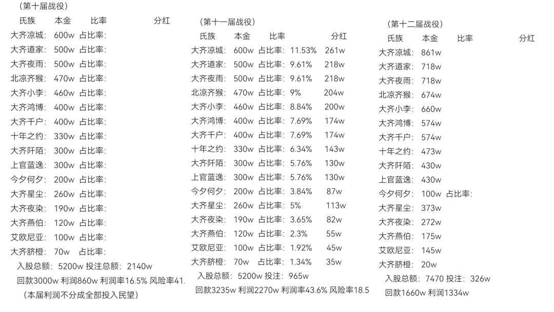 4、七月份赛季新开齐猴打算摸鱼,齐老人大部回归。此次赛季由凉城呼唤各测老人回归,又收新人增益.奈何凉城人事动员以后有事所忙不得已齐猴再次经营发展。此赛季人员增多,齐猴再次尝试统一经济以集中打分散。次测齐成员入股齐猴巅峰时刻多达20多人,此次不难看出各成员如此看好齐猴操盘能力。