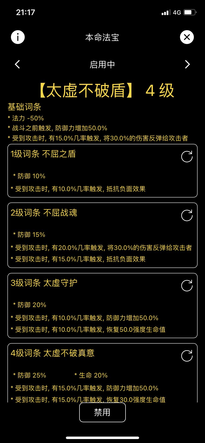 太虚不破盾基础词条:法力-50% 战斗之前触发,防御力增加50% 收到攻击时有15%几率触发将30%伤害反弹给攻击者