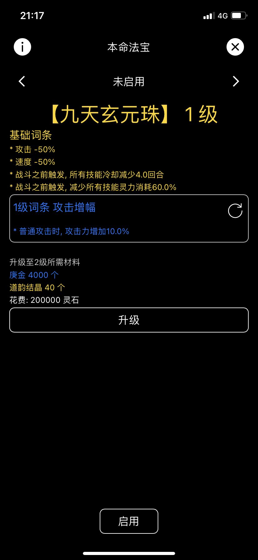 九天玄元珠基础词条:攻击-50% 速度-50% 战斗之前触发 所有技能冷却减少4回合 所有技能灵力消耗减少60%