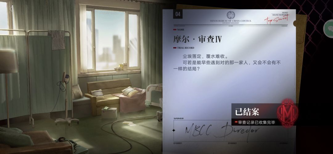 先说摩尔,看前面三段审查的时候,其实是有点失望的。总觉得太水了。在《幽零风暴》里,局长第一次遇到摩尔,然后在结局里应该是和摩尔达成了某些协议,所以摩尔才会出手相助。我原本以为审查会把这部分剧情补完,结果局长又再一次初见摩尔,最后局长和摩尔的枷锁还被斩断了。最后的报告说了,覆水难收,但是最后摩尔却没有对奶奶下杀手,或许,还会有变数。(在看完000的审查后,也许,现在的摩尔,已经是重置或者说是回溯过后的世界,所以摩尔和局长才会再一次初见面)