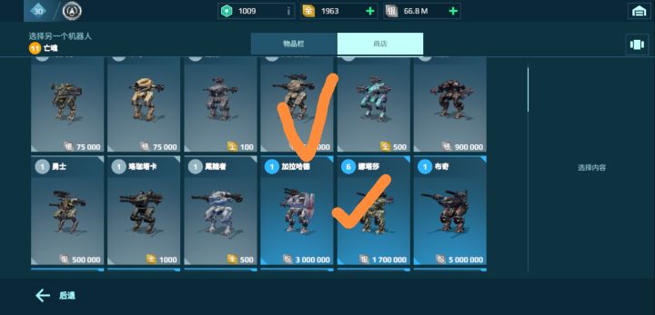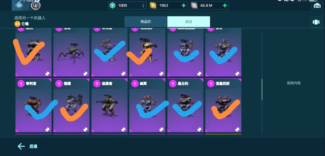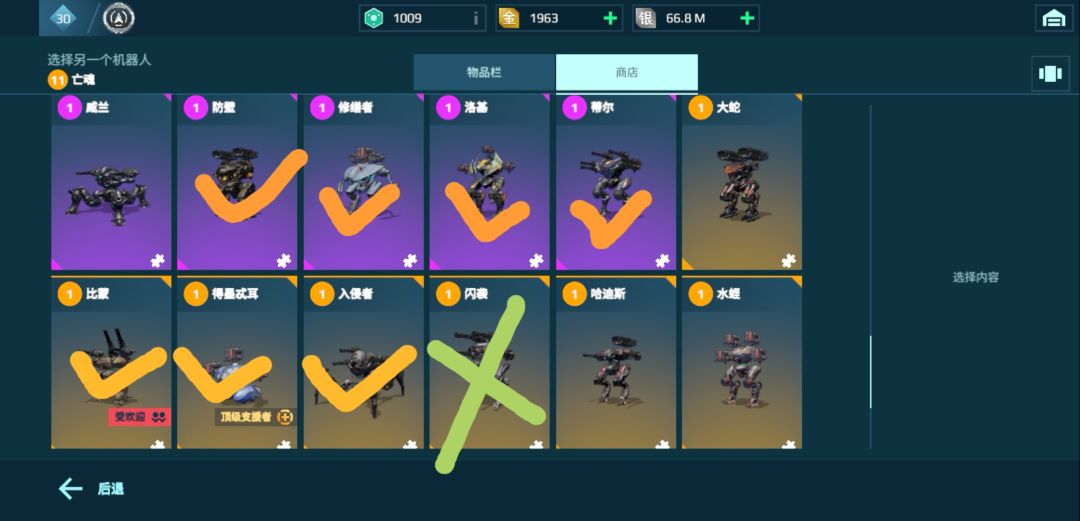 🤪没有打勾的:强度适中,能玩,但不是很强,你没有其他橙色机甲的,没有强势紫色机甲的可以养(举个例子,比如说你有猎鹰,涅莫西斯,你就可以晚一点培养这些没打勾的金色机甲,毕竟金色机甲太贵了)